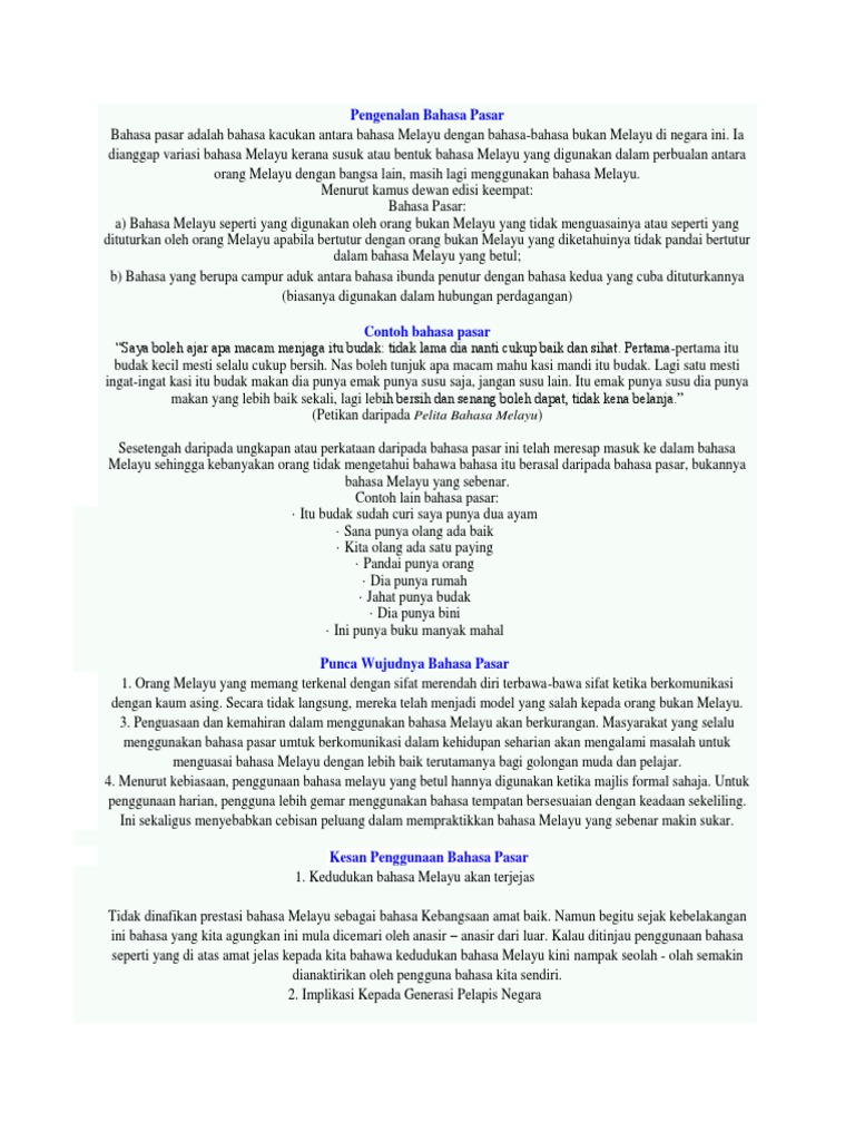 . Bahasa yang tidak betul struktur dan tatabahasanya. Dalam Kamus Besar Bahasa Indonesia Pasar merupakan tempat bertemunya penjual dan pembeli. Saya hendak ke membeli sayur.